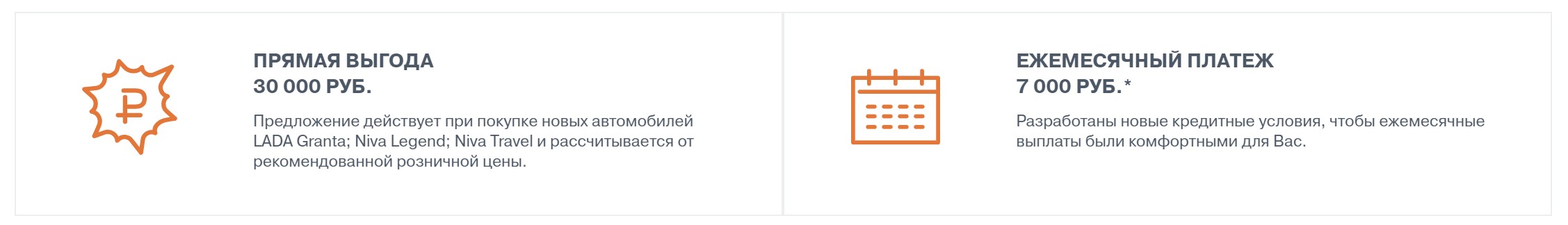 * 7000 — ежемесячный платеж по кредиту в АО «Авто Финанс Банк» (лицензия Банка России №170 от 06.09.2023 г.) по программе LADA ВЫГОДНЫЙ, действующей при покупке новых автомобилей LADA Granta; Niva Legend; Niva Travel (ТС) 2023 и 2024 г. в. и предоставляющей клиенту выгоду на покупку автомобиля в размере 30 000 руб. Параметры расчета LADA Granta: стоимость ТС — 669 900 руб. с учетом выгоды в размере 30 000 руб.; первоначальный взнос — 54,1%. Параметры расчета Niva Legend: стоимость ТС — 799 900 руб. с учетом выгоды в размере 30 000 руб.; первоначальный взнос — 61,5%. Параметры расчета Niva Travel: стоимость ТС — 1 168 900 руб. с учетом выгоды в размере 30 000 руб.; первоначальный взнос — 73,7%. Сумма кредита — 307 660 рублей. Срок кредита — 7 лет. Валюта — рубли РФ. Ставка в договоре — 20,9%. ПСК: 20,928–40,252% годовых. Расчет платежа произведен на 01 февраля 2024 г., является предварительным и может отличаться от фактического при изменении параметров кредита. Предложение действует при условии единовременного оформления на ТС договора имущественного страхования КАСКО в любых страховых компаниях, выбранных заемщиком и соответствующих требованиям Банка. При расторжении договора имущественного страхования КАСКО процентная ставка увеличивается на 1% годовых. Возврат кредита — ежемесячные (аннуитетные) платежи. Обеспечение — залог приобретаемого автомобиля. Действительно до 29.02.24. Предложение ограничено. Не оферта. Подробности по тел. 8-800-700-52- 32