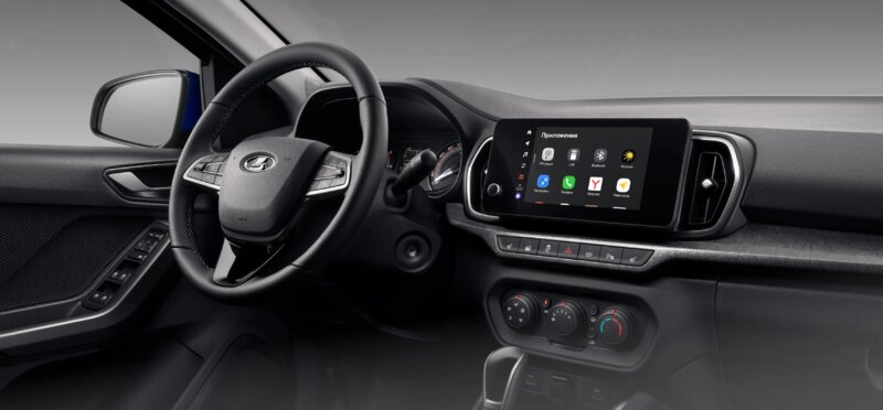 - Климат и мультимедиа — ромбовидные воздуховоды с удобными джойстиками, система LADA EnjoY Evo (8") с голосовым управлением, поддержкой Яндекс Авто, OTA-обновлений и двойным микрофоном с шумоподавлением.