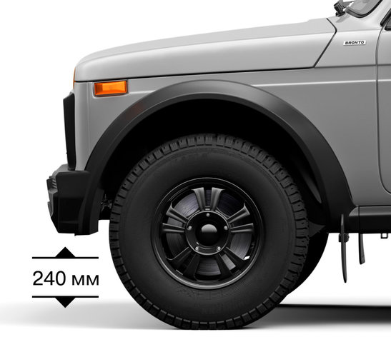 Надежное шасси Niva, созданное специально для бездорожья, стало еще прочней. В автомобиле LADA Niva Bronto усилены пружины, амортизаторы, задний мост. На каждой оси установлен самоблокирующийся межколесный дифференциал, а передаточное число главной пары теперь составляет 4.1. Повышенная тяга и клиренс в 240 мм — это залог уверенного преодоления бездорожья.